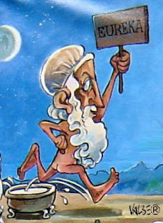 El matemático comenzó a cansarse más y a preocuparse. Sin embargo, sucedió que una hermosa mañana, mientras se encontraba desnudo en su bañera, el problema fue solucionado repentinamente. Se olvidó de todo y salió corriendo por la calle, desnudo y gritando: